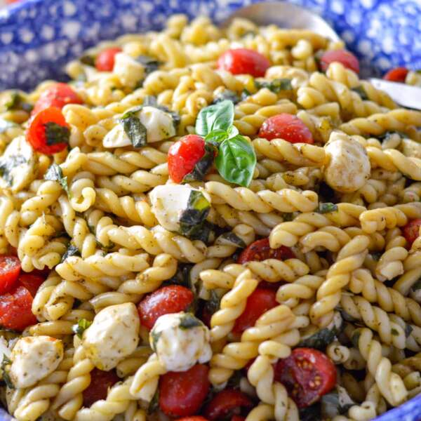 Start by cooking your preferred short pasta al dente in a large pot of salted water, following the package directions. While your pasta is cooking, prepare your pasta salad dressing in a small mixing bowl or small mason jar. Also, you can prep your basil, tomatoes and mozzarella and set aside. Once your pasta is done cooking, rinse for about a minute or two under cool water to stop the cooking process. I donโt like to run it under water too long because I feel the dressing soaks into the pasta better when itโs a little warm. After you drain and slightly cool the pasta, add it to a large bowl with your dressing, tomatoes and basil. Then chill the pasta salad in the fridge at least 2 hours. Once itโs ready to serve, fold in your halved mozzarella balls and adjust seasoning if need be.
